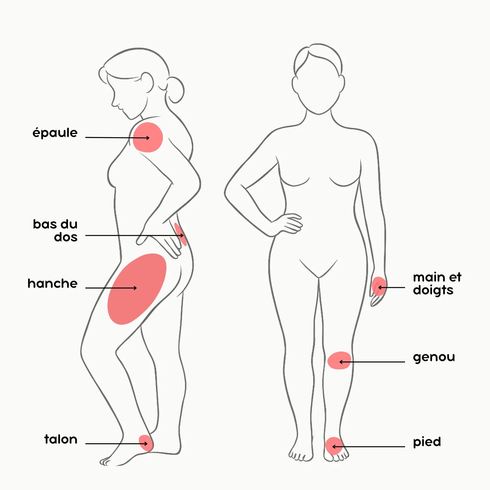 - Hanches et fessiers — tendons enflammés, douleurs en marchant, en montant les escaliers ou en dormant sur le côté.